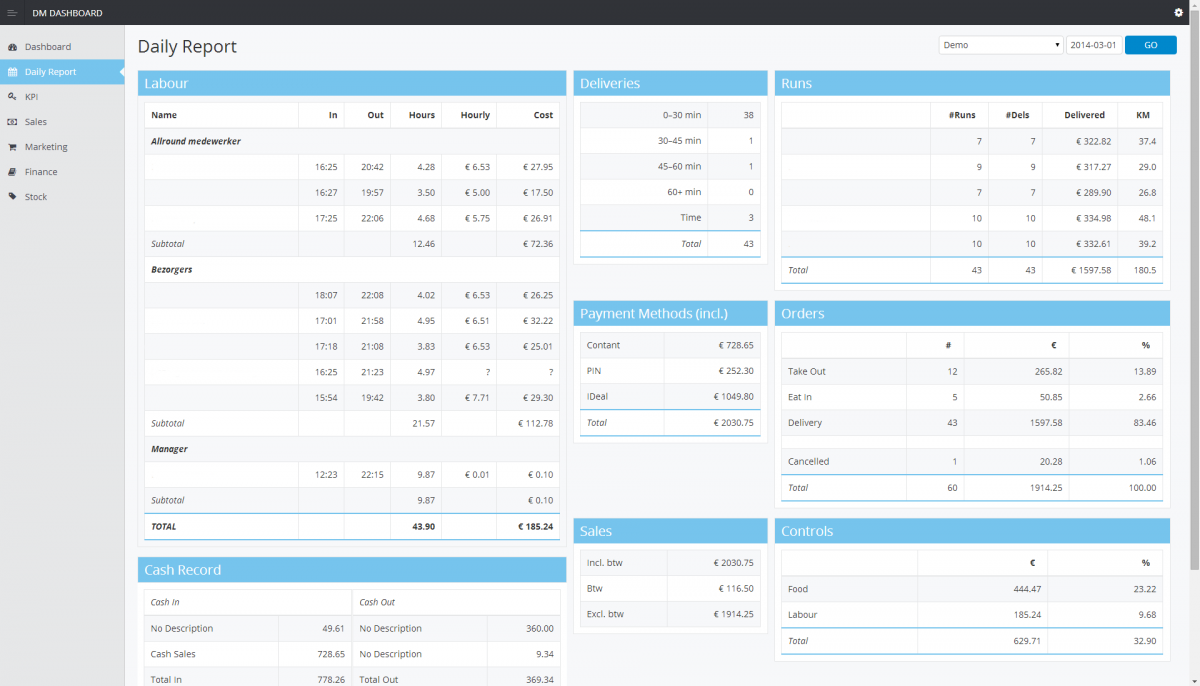 Het DM Dashboard is een Cloud gebaseerde, betaalbare oplossing waarbij de gebruiker een volledig up-to-date en real-time overzicht krijgt van financiële gegevens, marketinginformatie, voorraad (en verbruik) en personeelsinformatie.